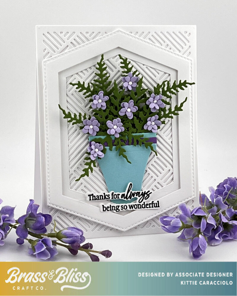I love that Brass and Bliss added the newly released Fern Leaves set that creates more opportunities for floral designs. I highlighted my bouquet with a double matted frame using the new Tall Hex Nesting set to create dimension and finished using the Large Garden Pots. Thank You Stamp, Thank You Coordinating Die, Basket Weave Cover and Small Flowers #3.